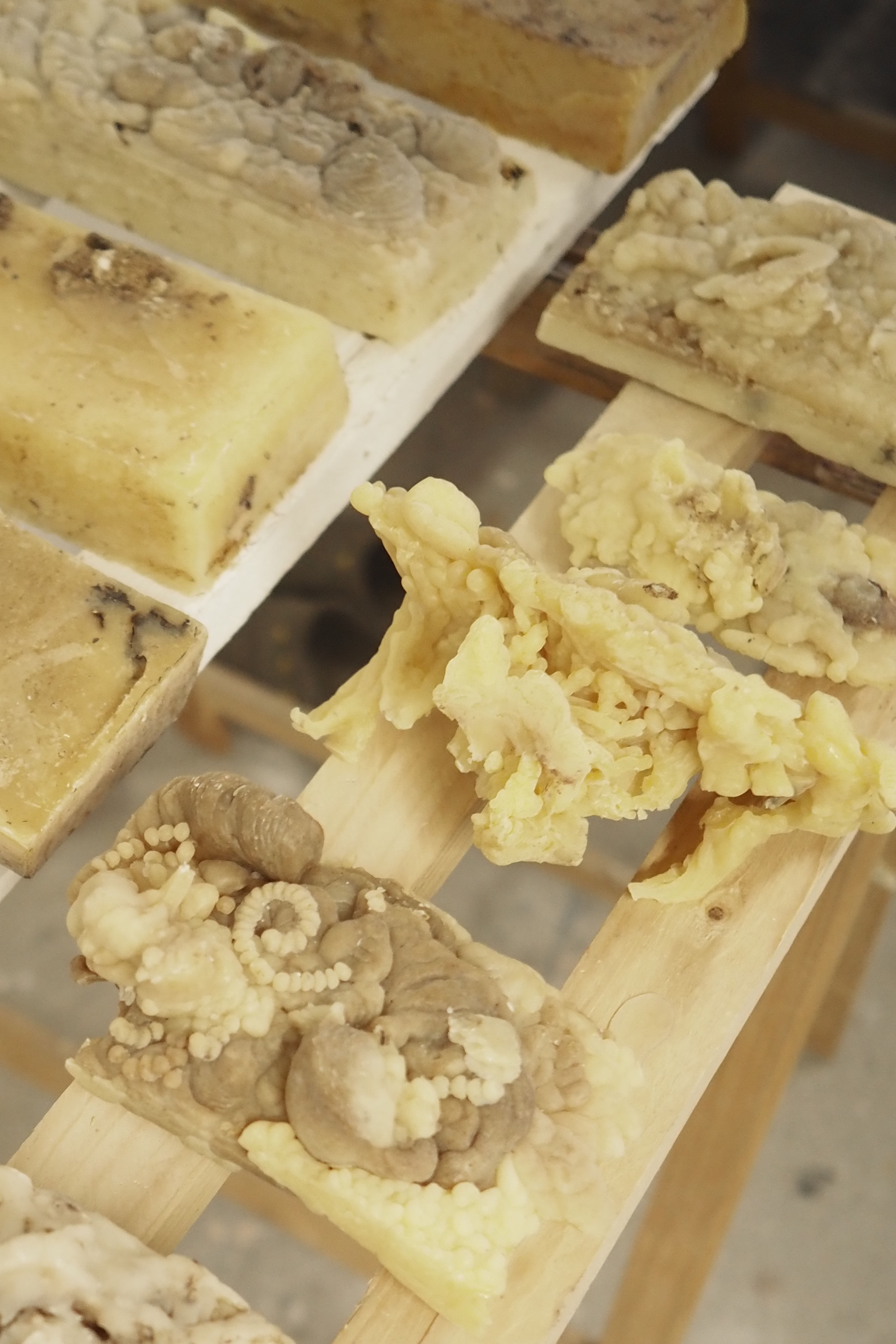 I printed a series of concrete poems on the letterpress. In concrete poetry the meaning of a text is found in the layout, the typographical elements, so you can use words as a visual material. One of my prints features a block of text made with the words ‘Wand’ (wall) and ‘Wandel’ (change). I also used bricks and local beeswax to make some sculptural pieces, as well as taking analogue photographs that I printed in the photo studio at HALLE 14 Zentrum für Zeitgenössische Kunst.